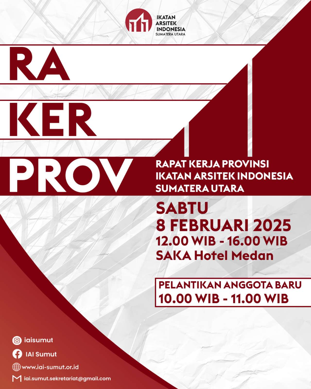 Rapat Kerja Provinsi (Rakerprov) Ikatan Arsitek Indonesia Provinsi Sumatera Utara diselenggarakan oleh Ikatan Arsitek Indonesia Provinsi Sumatera Utara dengan mengikuti tata tertib yang berlaku dan sesuai ketentuan organisasi.